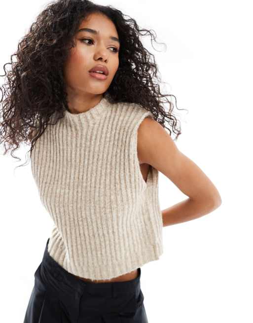 4th & Reckless - Grofgebreide hoogsluitende mouwloze trui in camel