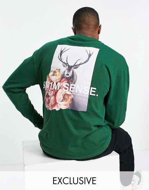 9N1M SENSE - Exclusief bij ASOS - T-shirt met lange mouwen in groen met hertenprint