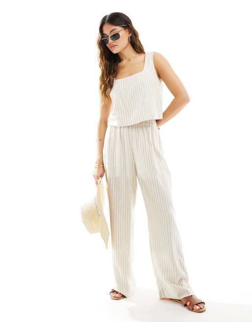 Abercrombie & Fitch - Gestreepte broek met wijde pijpen en elastische taille van linnenmix in beige en wit