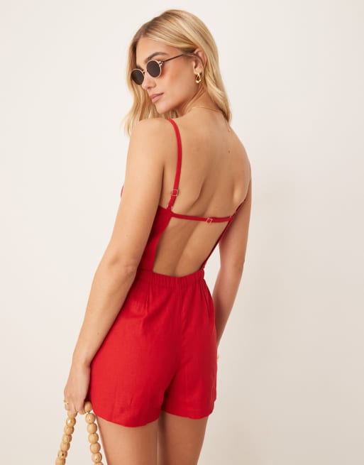 Abercrombie & Fitch - Jumpsuit van linnenmix met schort halslijn in rode vierkante print