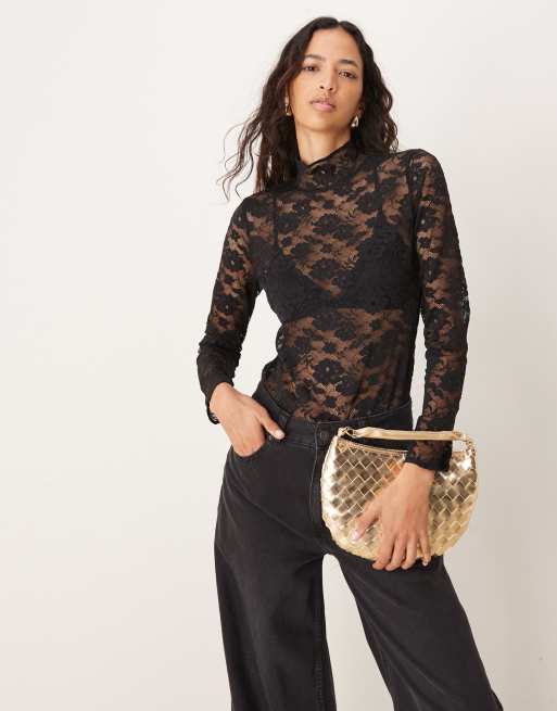 Abercrombie & Fitch - Kanten top met hoogsluitende hals en lange mouwen in zwart