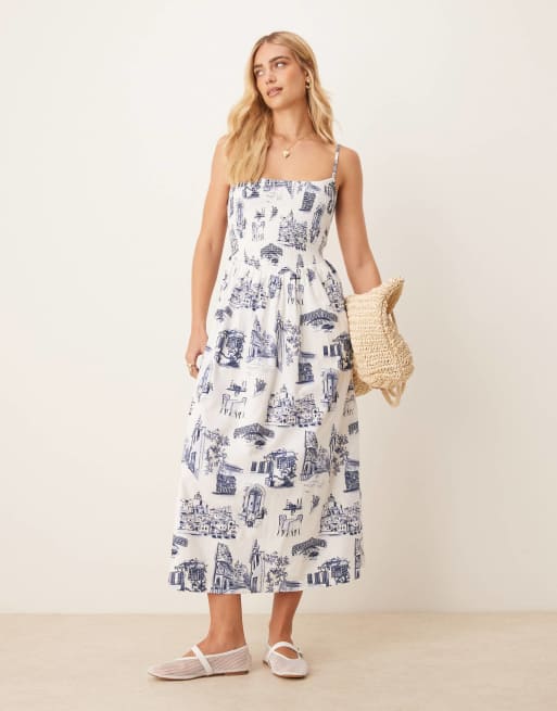 Abercrombie & Fitch - Poplin midi smokjurk met verlaagde taille en print in blauw en wit