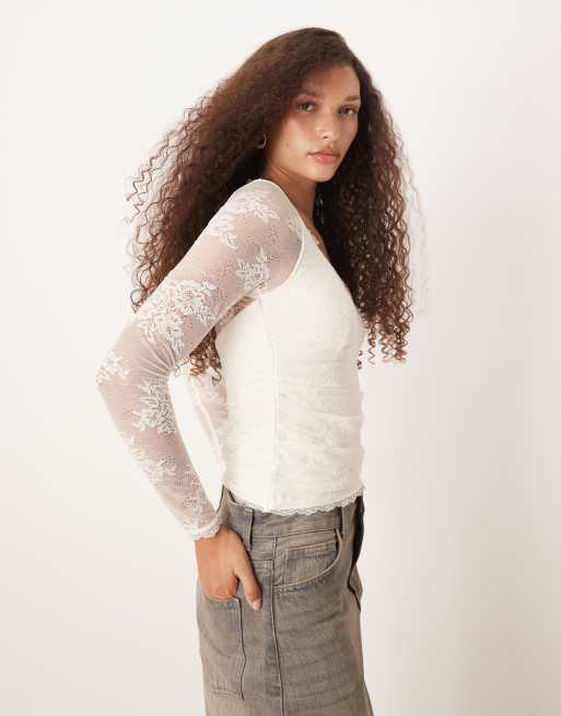 Abercrombie & Fitch - Top met lange mouwen, hartvormige halslijn en kant in wit