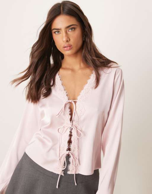 Abercrombie & Fitch - Top met lange mouwen, kant en gestrikte voorkant in lichtroze