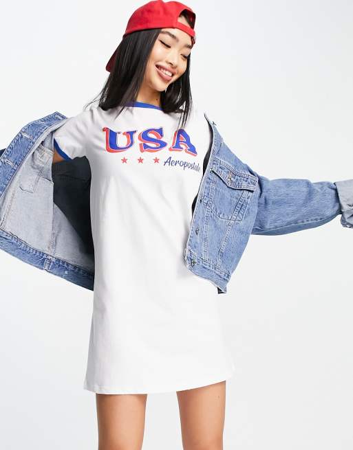 Aeropostale - T-shirtjurk met gekleurde randjes en USA-logo in wit
