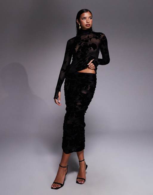 AFRM - Co-ord set van top met col en midaxi rok met geflockte bloemenprint in zwart