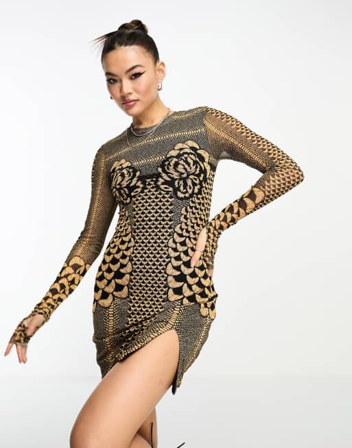 AFRM - Lasso - Mini jurk van mesh met goudkleurige bladprint