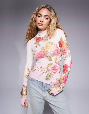 AFRM - Top van mesh met lange mouwen in vallende rozenprint