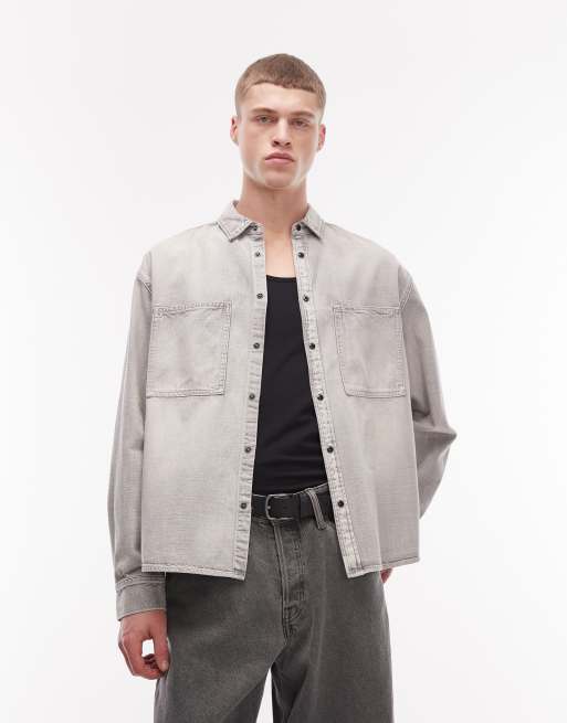 AllSaints - Denim overhemd van canvas met lange mouwen in lichtgrijs met wassing