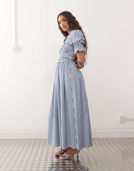 Amy Lynn - Gestreepte midi jurk van katoen met pofmouwen in blauw