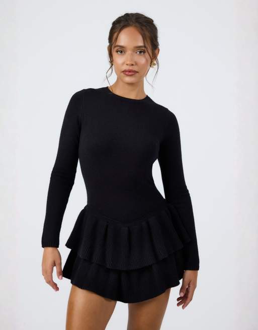 Aria Cove - Gebreide mini jurk met lange mouwen en rok met ruches in zwart
