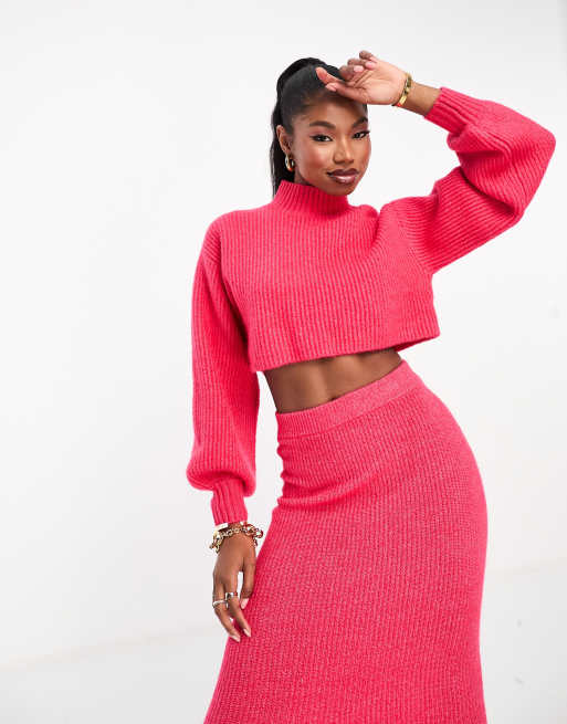 Aria Cove - Geribbelde cropped coltrui met volumineuze mouwen in roze, deel van co-ord set