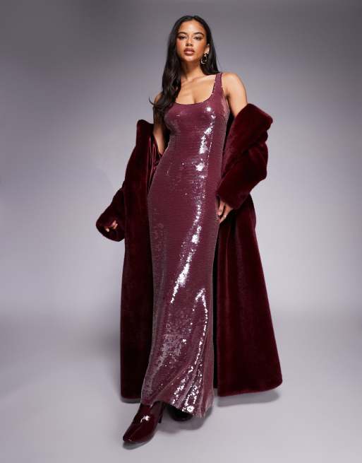 Aria Cove - Maxi-jurk met lovertjes en lage ronde hals in bordeauxrood