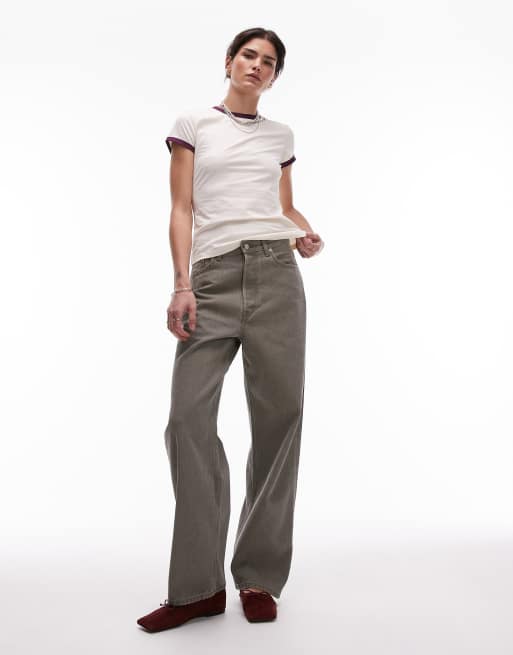 ARKET - Amber - Jeans met wijde ronde pijpen en naaddetail in kaki met wassing