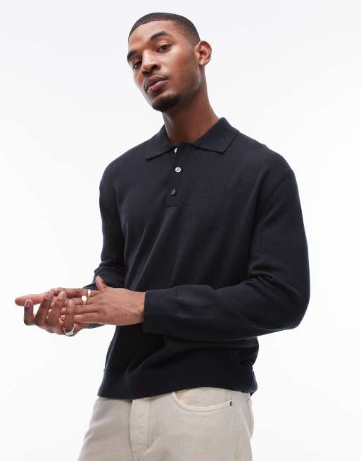 ARKET - Gebreid poloshirt van merinowol met lange mouwen in marineblauw