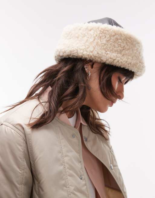 ARKET - Premium leren hoed met omgeslagen voering van imitatieschapenvacht in zwart en crème