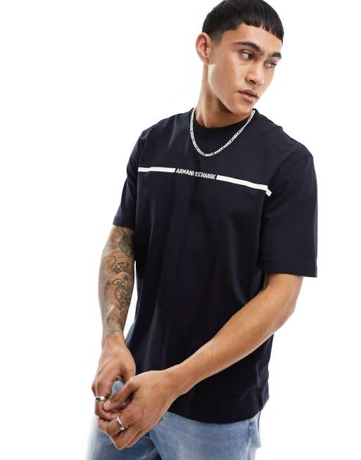 Armani Exchange - T-shirt van zware stof met streep en logo op de borst in marineblauw