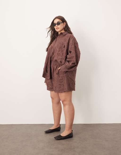 ARRANGE Curve - Katoenen short met uitsnijdingen en gespiegeld geborduurd bloemenpatroon in donkerbruin, deel van co-ord set