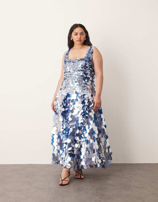 ARRANGE - Curve - Midi-jurk met vierkante hals en volle rok versierd met grote lovertjes in blauw