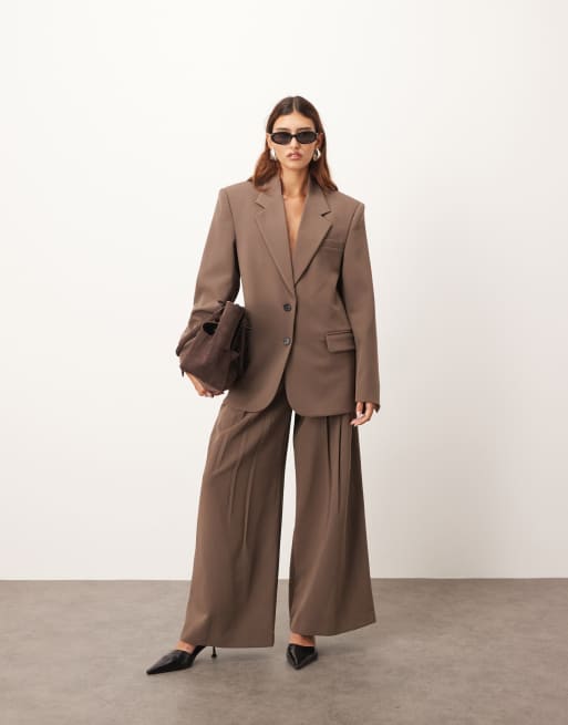 ARRANGE - Geplooide broek met wijde pijpen en wollook in chocoladebruin, deel van co-ord set
