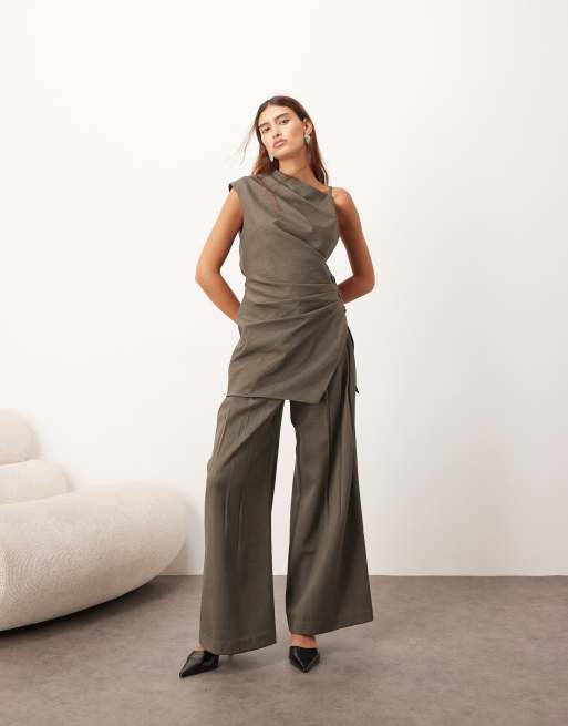 ARRANGE - Geplooide broek met wijde pijpen en wollook in donker kaki, deel van co-ord set