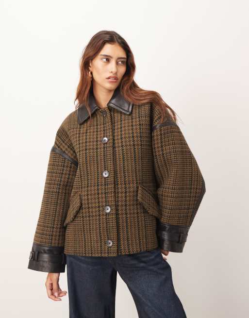 ARRANGE - Jas van geborstelde wolmix met pied-de-poule motief en leren detail in bruin
