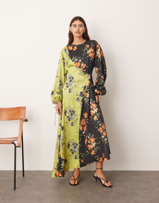 ARRANGE - Maxi jurk van kreukelsatijn met lange mouwen en afwerking in kleurvlakken met bloemenprint