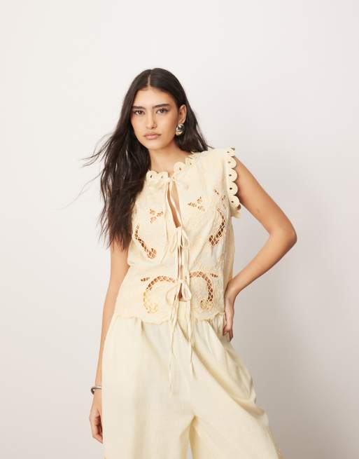 ARRANGE - Opengewerkte katoenen top met borduursels en gestrikte voorkant in citroengeel, deel van co-ord set
