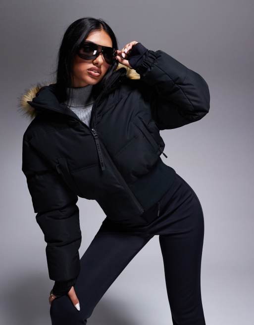 4505 - Ski - Geïsoleerde cropped ski bomberjack met capuchon van imitatiebont in zwart