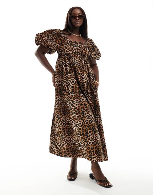 ASOS DESIGN Curve - Aangerimpelde midi-jurk met pofmouwen en dierenprint in zwart-wit