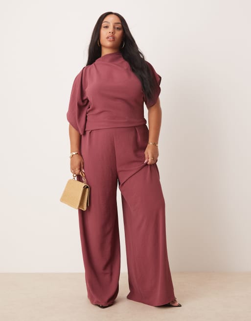 ASOS DESIGN Curve - Asymmetrische gedrapeerde jumpsuit in bordeauxrood met wassing