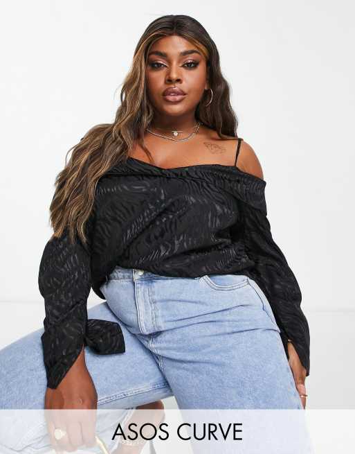 ASOS DESIGN Curve - Blouse met blote schouders van jacquard met tijgerstreep in zwart