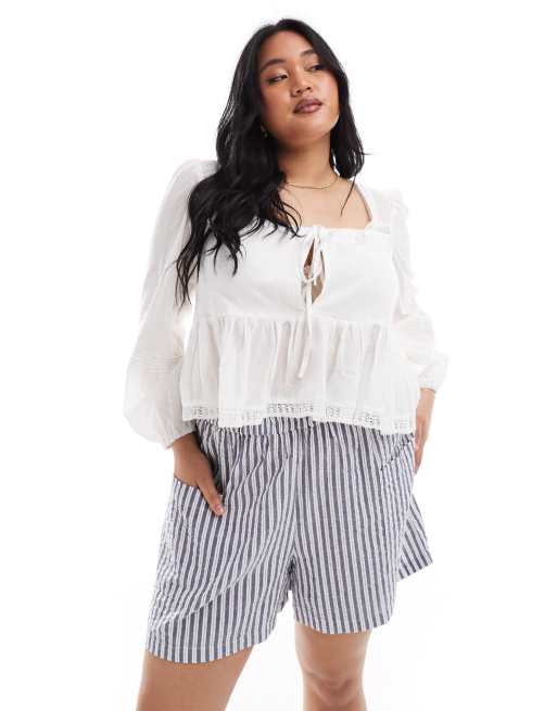 ASOS DESIGN Curve - Blouse met lange mouwen en vierkante hals en kanten inzetstukken in crème