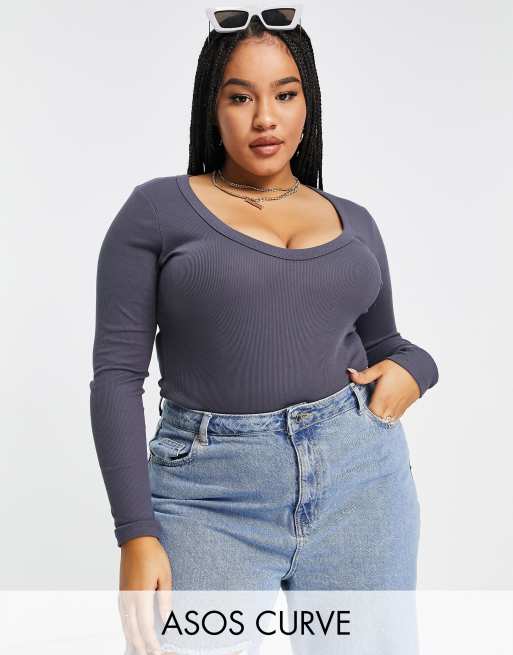 ASOS DESIGN Curve - Body met lange mouwen, lage ronde hals en brede randen in grijs
