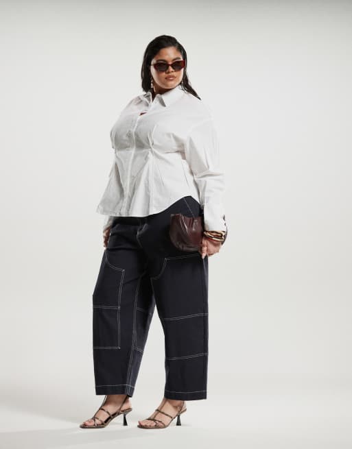 ASOS DESIGN Curve - Broek met ronde wijde pijpen in marineblauw met contrasterende stiksels