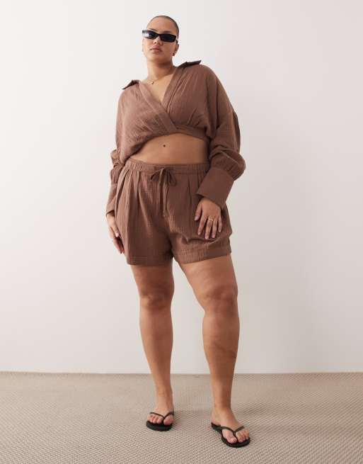 ASOS DESIGN Curve - Callie - Strandshort van kaasdoek met taille met plooirand in mokka