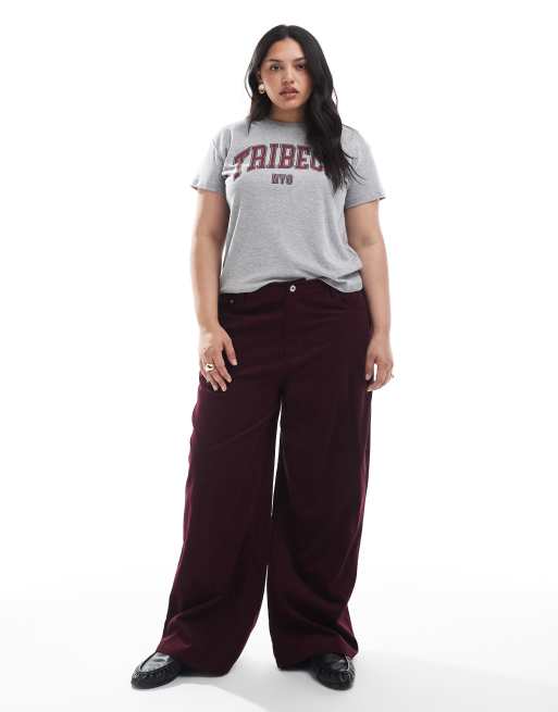 ASOS DESIGN Curve - Corduroy broek met wijde pijpen in bordeauxrode krijtstreep