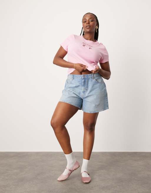 ASOS DESIGN Curve - Denim dad short in blauw met lichte wassing