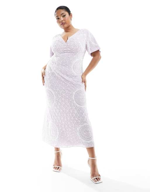 ASOS DESIGN Curve - Exclusive - Diepuitgesneden midi jurk met fladdermouwen en cirkelvormige versiering in lila