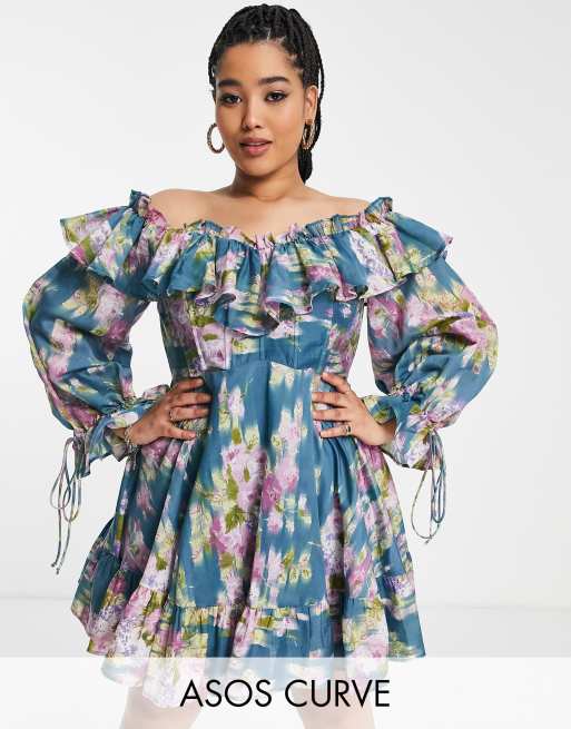 ASOS DESIGN Curve - Exclusives - Mini jurk met blote schouders, ruches en bloemenprint