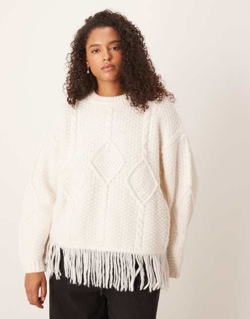 ASOS DESIGN Curve - Gebreide trui met kabels, ronde hals en franjes in crème