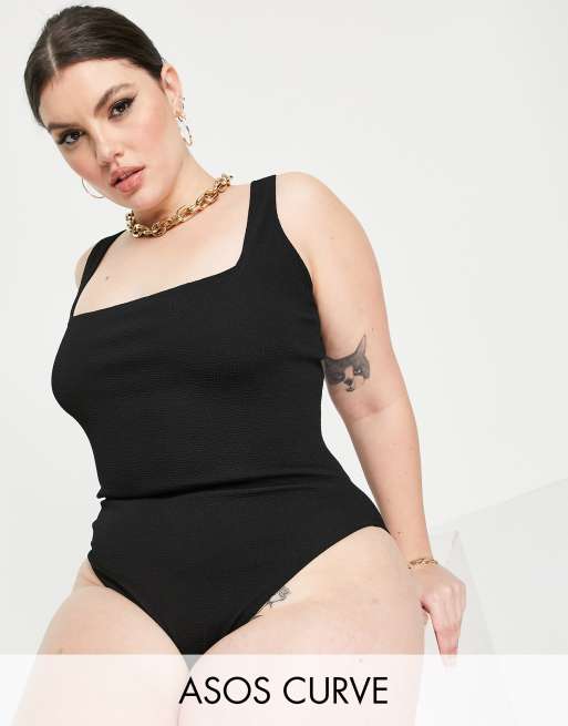 ASOS DESIGN curve - Gekreukt badpak met vierkante hals in zwart
