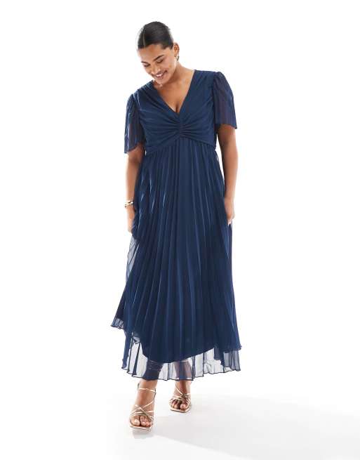 ASOS DESIGN Curve - Geplooide midi-jurk met geplooid lijfje en fladdermouwen in marineblauw