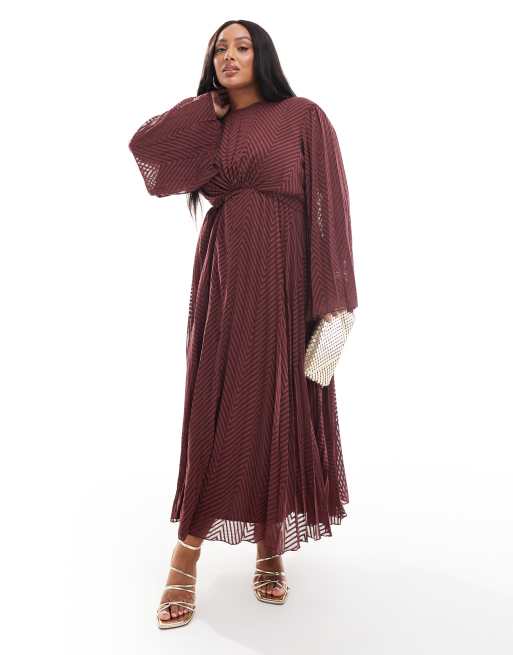 ASOS DESIGN Curve - Geplooide midi-jurk van chiffon met uitlopende mouwen, chevronmotief en gestrikte achterkant in bordeauxrood