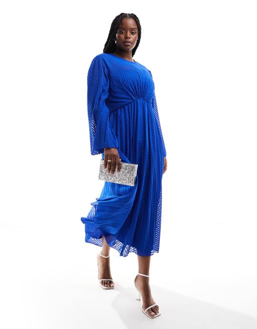 ASOS DESIGN Curve - Geplooide midi jurk van chiffon met uitlopende mouwen, gestrikte achterkant en zigzagmotief in kobaltblauw