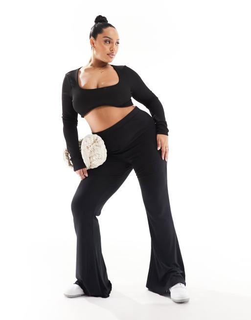 ASOS DESIGN Curve - Geribbelde flare broek met geschulpte zoom in zwart