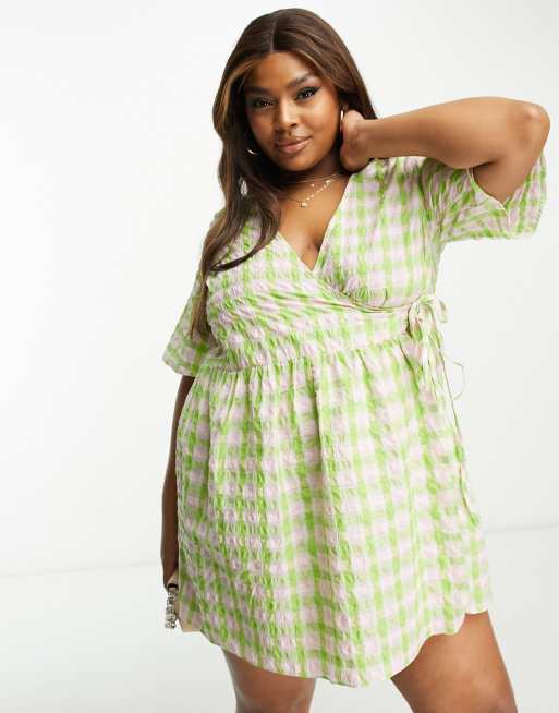 ASOS DESIGN Curve - Geruite mini-smockjurk met overslag in roze en groen