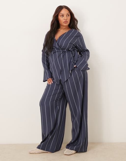 ASOS DESIGN Curve - Gestreepte broek met wijde pijpen in blauw, deel van co-ord set