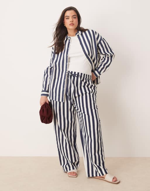ASOS DESIGN Curve - Gestreepte co-ord set met linnenlook met overhemd en broek in marineblauw