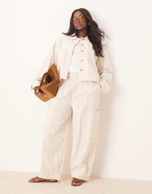 ASOS DESIGN Curve - Katoenen broek met wijde pijpen en utility zakken in ecru gestreept, deel van co-ord set